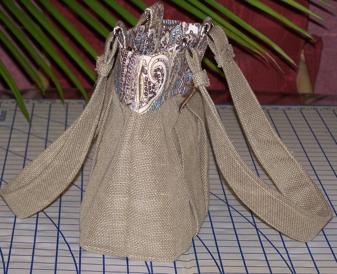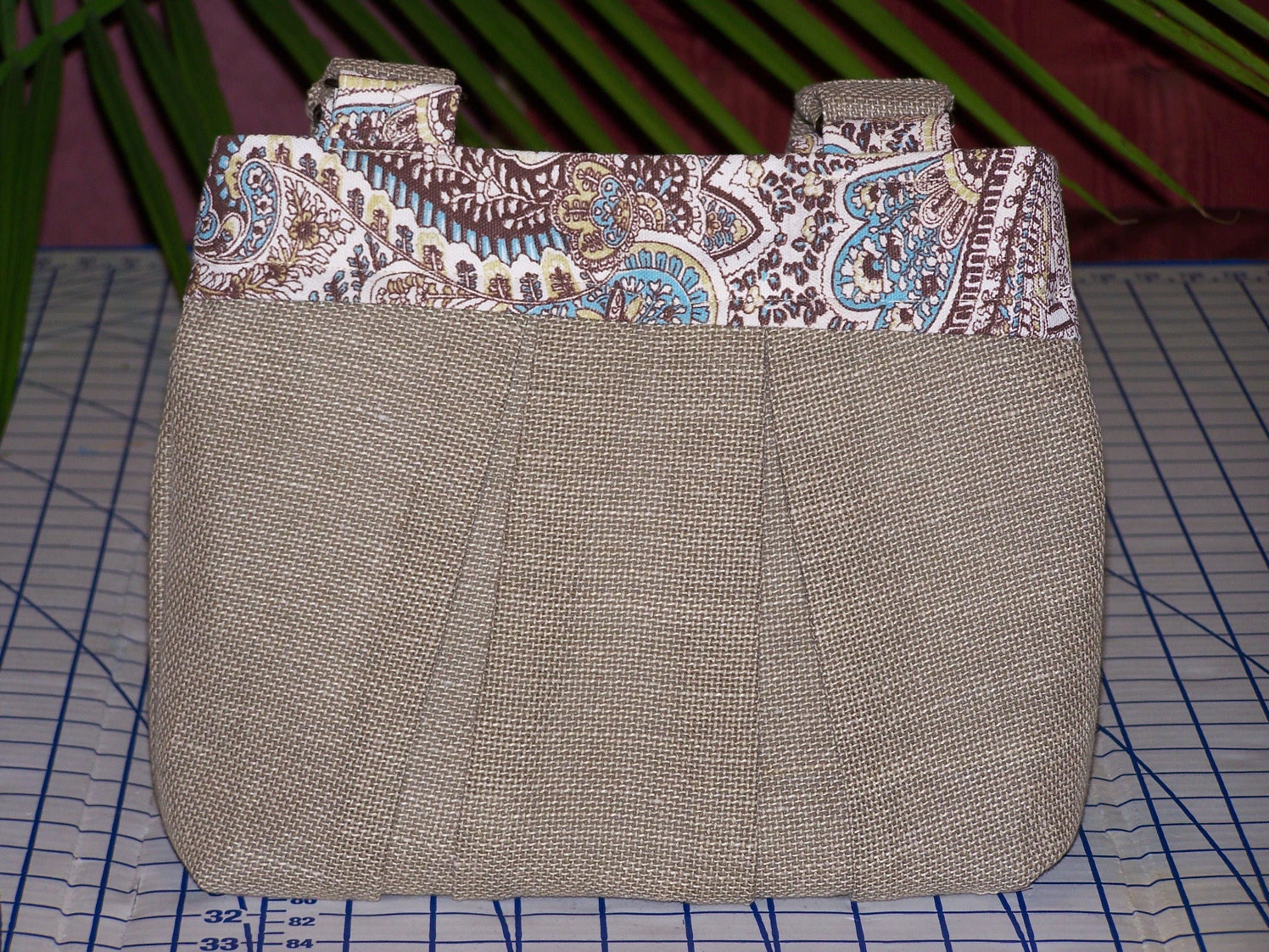 The upcycle Linen Safari Handbag, is pure joy!  Using a burlap curtain panel and paisley fabric remnants to create this pleated design, is  strictly dedicated to my neutral color purse fans.  After receiving the results from the “Color My Purse Beautiful” poll. I decided to create something in a neutral color.  I must admit that I like bold colors, but my goal is to make something that people love.