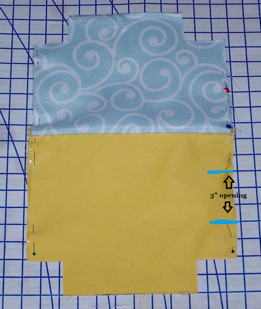 Sew 1/4″ seam along the sides and bottom. Leave a 3″ opening on one side of the inside panel. Double stitch above and below the opening.