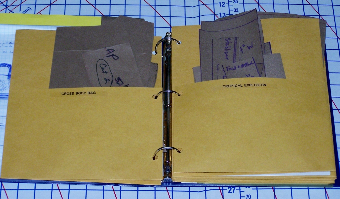 Since I design my own patterns, I placed each pattern in a pocket divider, and labeled each pocket so that I can return it to its proper place. This also works with PDF downloaded patterns too!