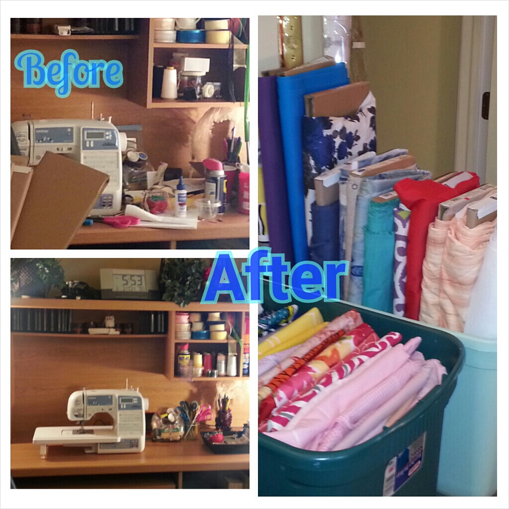 Before, as you can see there were things thrown everywhere! After searching for what I needed… I didn’t put it back, because I would only need it again. While shopping at the fabric store, I asked the girls at the cutting counter for the cardboard used to store bolts of fabric. They were more than happy to give me 10 of them to recycle!