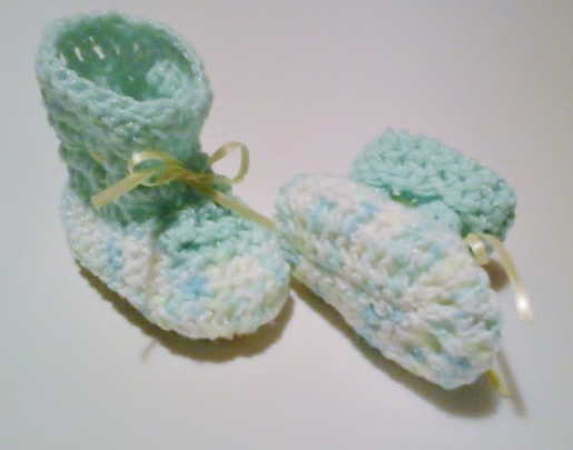 I’ve been working on LaCartera Baby Style. Since I have two months until I know the sex of my grand-babies, I tried to keep the style neutral. Two color crochet baby booties topped off with a yellow ribbon.