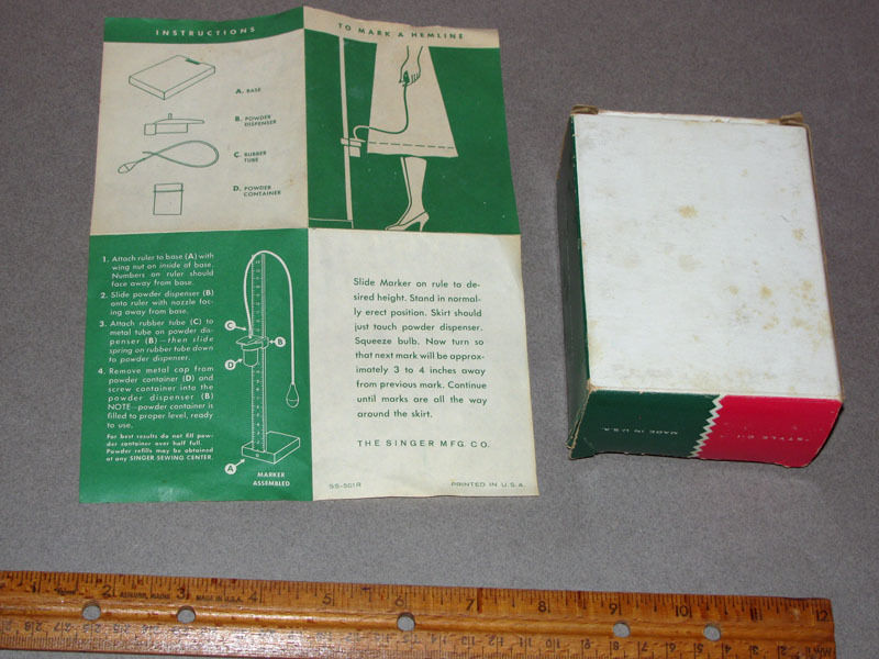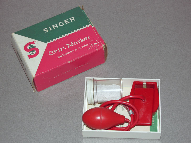 During 1950 Singer found a way to allow an individual to hem their skirt or dress without any help from others. I love the price of $1.98 (USD). The vintage skirt markers can still be found on Etsy and Ebay, but not for $1.98. I found the average price for the vintage ruler, chalk and bulb was $9-$30 (USD).