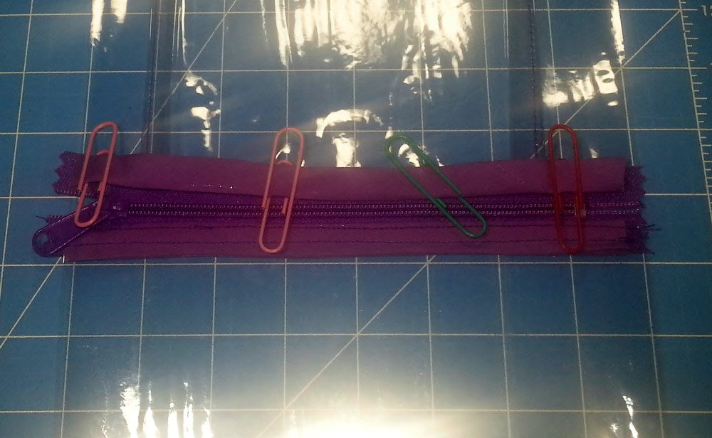 • Fold the bottom of the vinyl 1/2 inch toward the front of the pocket, place the fold in between the bias tape strip, center on the first zipper and sew two seams 1/4″ on the top and bottom of the bias tape .