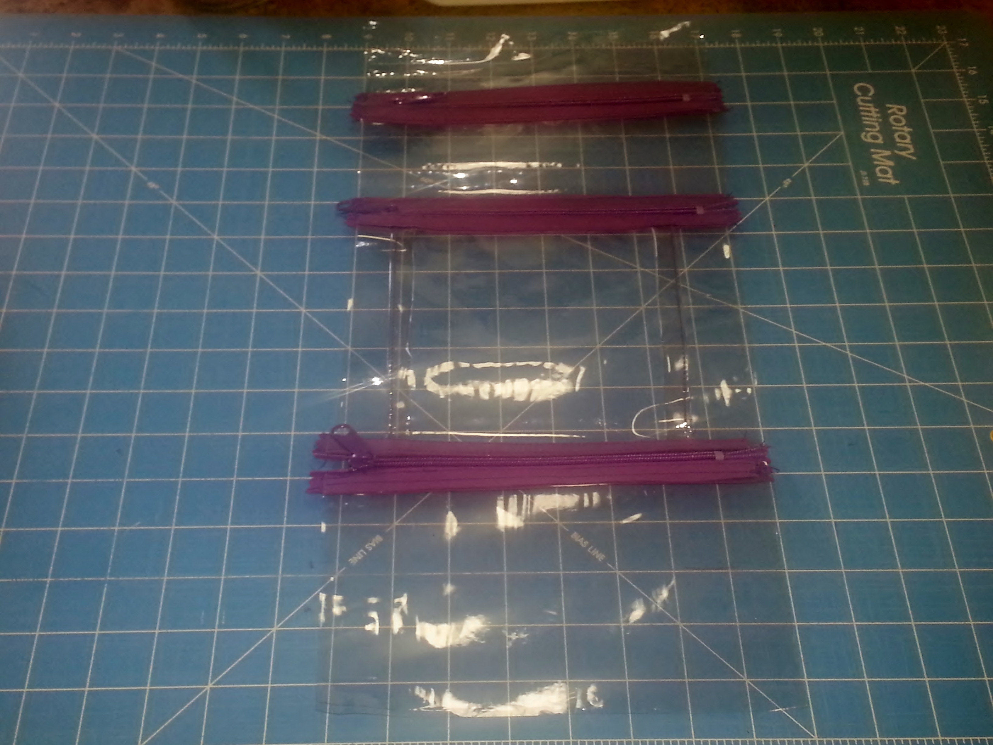 1. Sew zippers onto vinyl pockets:  Start with bottom pocket and work toward the top. (*Note: When sewing the zipper onto the vinyl, set your stitch tension to 3.0 for the length of the stitch and 1.0 for the stitch width.)