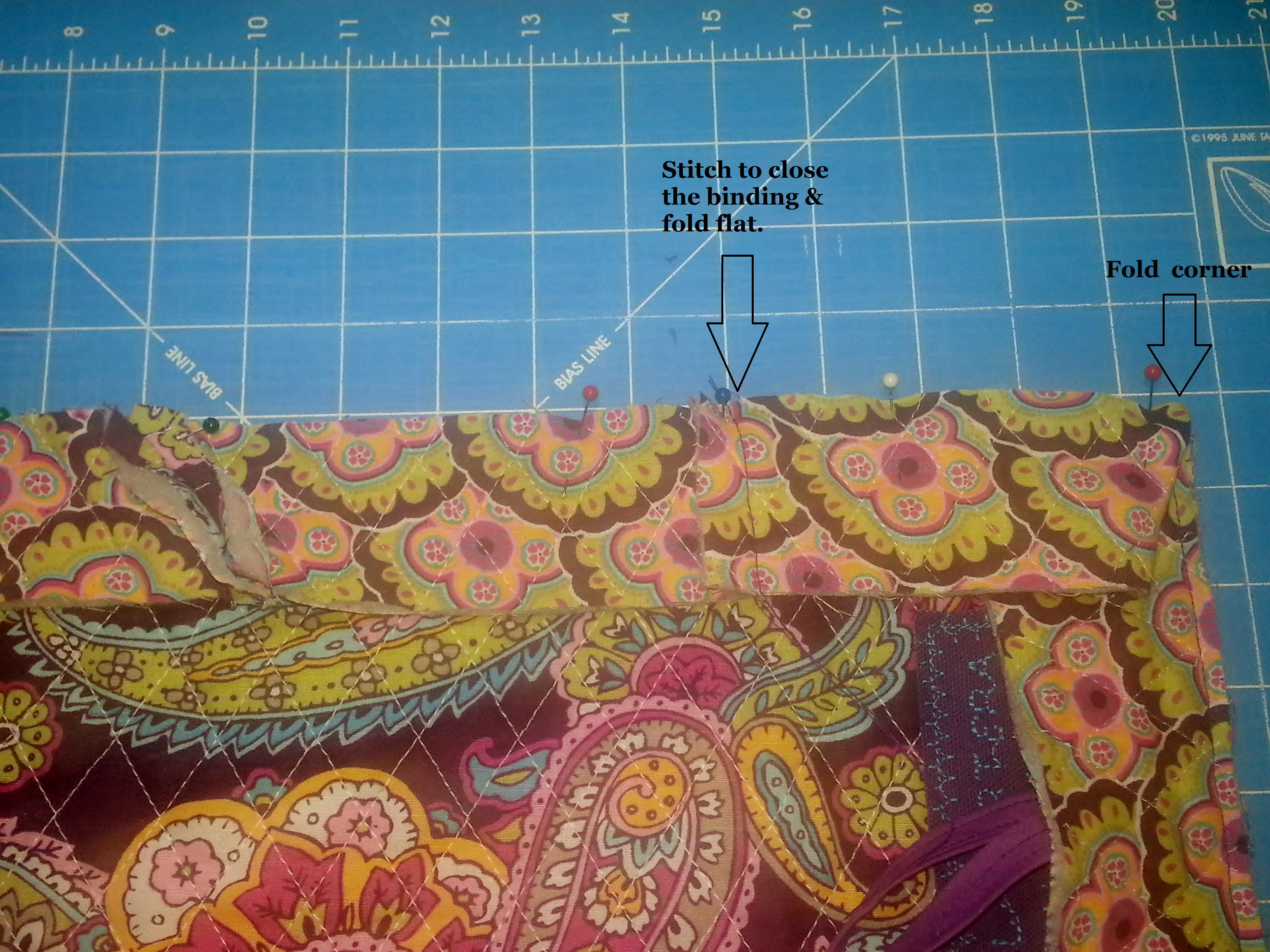 • Fold the binding trim flat across the next corner pin in place and sew to the second corner.